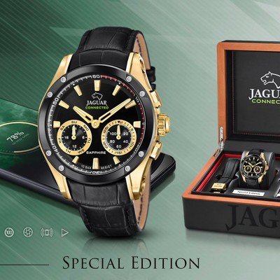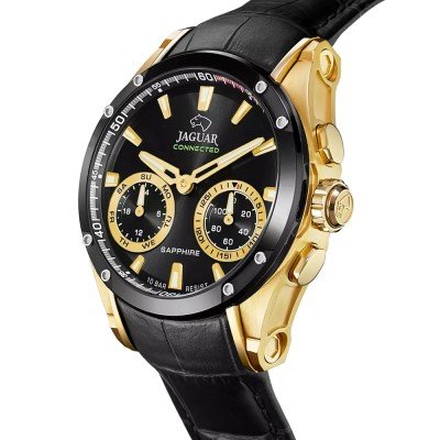 Este relógio Jaguar tem uma caixa de Inox com um diâmetro de 45 mm e está equipado com uma bracelete de couro. A caixa possui um movimento Kronaby e o relógio tem um vidro Safira.