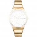 Esta bracelete de relógio Lacoste é feita de aço inoxidável e está fixada ao relógio através de pinos de pressão. A bracelete tem uma largura de 20 mm e fecha através de fivela dobrável com botões de pressão. A bracelete não tem uma montagem a direito, o que significa que esta bracelete só é adequada para os relógios listados abaixo.