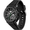 Este relógio Lacoste tem uma caixa de Resina com um diâmetro de 45 mm e está equipado com uma bracelete de borracha. A caixa possui um movimento Seiko e o relógio tem um vidro Mineral.
