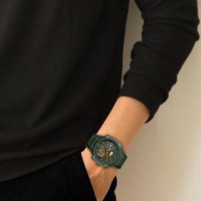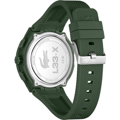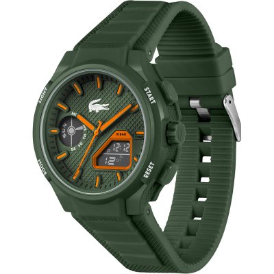 Este relógio Lacoste tem uma caixa de Resina com um diâmetro de 45 mm e está equipado com uma bracelete de borracha. A caixa possui um movimento Seiko e o relógio tem um vidro Mineral.
