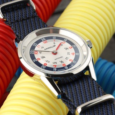 Lançado pela primeira vez em 1969, o Minilip automático era um relógio destinado a crianças de 6 a 8 anos, especialmente projetado para aprender a ler as horas com um dispositivo pedagógico inovador. O Minilip originalmente apresentava um mostrador em três partes, permitindo a leitura dos minutos, das horas da manhã e das horas da tarde. Hoje, o relógio é reimaginado em um estojo de 29 mm para adultos e crianças. O primeiro círculo indica as horas da tarde, das 13h até à meia-noite (daí a cor escura), enquanto o segundo círculo indica as horas da manhã, da meia-noite até ao meio-dia. Esses dois círculos podem ser lidos com a agulha das horas vermelha no mostrador, que corresponde aos números vermelhos no mostrador interior. O círculo central exibe os minutos de forma muito explícita: "5", "10", "e um quarto", "e meia".