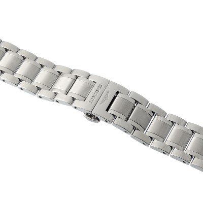 Esta bracelete de relógio Longines é feita de aço inoxidável e está fixada ao relógio através de pinos de pressão. A bracelete tem uma largura de 19 mm e fecha através de fivela butterfly com botões de pressão. A bracelete não tem uma montagem a direito, o que significa que esta bracelete só é adequada para os relógios listados abaixo.