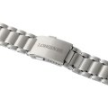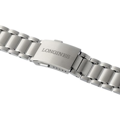 Esta bracelete de relógio Longines é feita de titânio e está fixada ao relógio através de pinos carregados por mola de liberação rápida. A bracelete tem uma largura de 22 mm e fecha através de fivela dobrável com botões de pressão. A bracelete não tem uma montagem a direito, o que significa que esta bracelete só é adequada para os relógios listados abaixo.