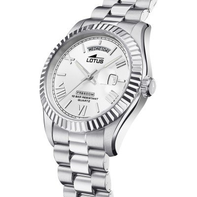 Este relógio Lotus tem uma caixa de Inox com um diâmetro de 41 mm e está equipado com uma bracelete de Inox. A caixa possui um movimento Miyota e o relógio tem um vidro Mineral.
