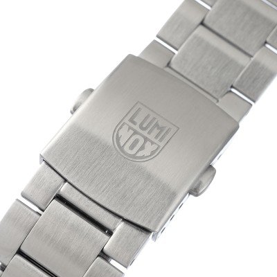 Esta bracelete de relógio Luminox é feita de aço inoxidável e está fixada ao relógio através de pinos de pressão. A bracelete tem uma largura de 22 mm e fecha através de fivela dobrável com botões de pressão. A bracelete não tem uma montagem a direito, o que significa que esta bracelete só é adequada para os relógios listados abaixo.