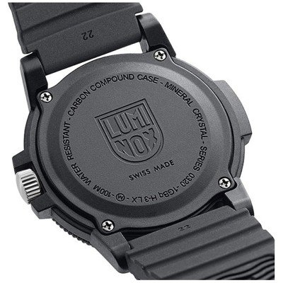 Este relógio Luminox tem uma caixa de Carbono com um diâmetro de 44 mm e está equipado com uma bracelete de borracha. A caixa possui um movimento Ronda e o relógio tem um vidro Mineral resist.
