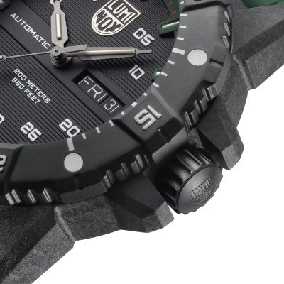 O Master Carbon Seal Automatic possui uma caixa de 45 mm fabricada em Carbonox. Trata-se de um novo material composto que é leve, hipoalergénico, resistente às intempéries, aos choques e aos riscos. Esta caixa aloja um movimento automático suíço Sellita para uma excelente precisão. O relógio tem um toque distinto de exterior com a sua bracelete de borracha verde e pormenores verdes. Além disso, pode contar com todos os pormenores pelos quais a Luminox é famosa: durabilidade, luminosidade, resistência à água e legibilidade.