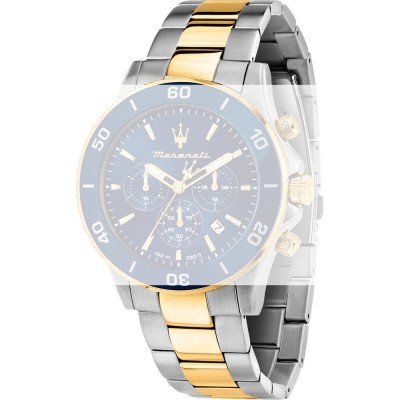 Esta bracelete de relógio Maserati é feita de aço inoxidável e está fixada ao relógio através de pinos de pressão. A bracelete tem uma largura de 22 mm e fecha através de fivela dobrável com botões de pressão. A bracelete não tem uma montagem a direito, o que significa que esta bracelete só é adequada para os relógios listados abaixo.