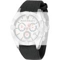 Esta bracelete de relógio Maserati é feita de silicone e está fixada ao relógio através de pinos de pressão. A bracelete tem uma largura de 26 mm e fecha através de fecho. A bracelete não tem uma montagem a direito, o que significa que esta bracelete só é adequada para os relógios listados abaixo.