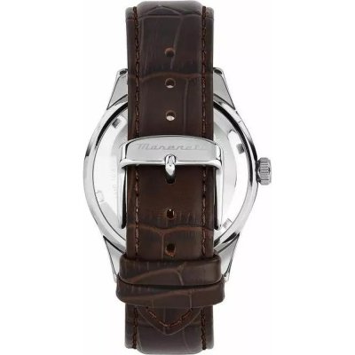 Este relógio Maserati tem uma caixa de Inox com um diâmetro de 42 mm e está equipado com uma bracelete de couro. A caixa possui um movimento Miyota e o relógio tem um vidro Mineral.
