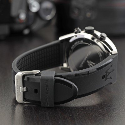 Este relógio Maserati tem uma caixa de Inox com um diâmetro de 45 mm e está equipado com uma bracelete de borracha. A caixa possui um movimento Miyota e o relógio tem um vidro Mineral.