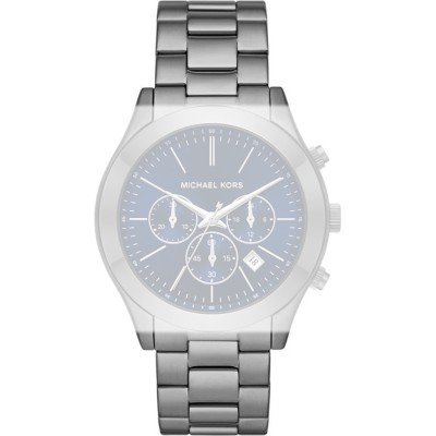 Esta bracelete de relógio Michael Kors é feita de aço inoxidável e está fixada ao relógio através de pinos de pressão. A bracelete tem uma largura de 22 mm e fecha através de fivela dobrável com botões de pressão. A bracelete não tem uma montagem a direito, o que significa que esta bracelete só é adequada para os relógios listados abaixo.