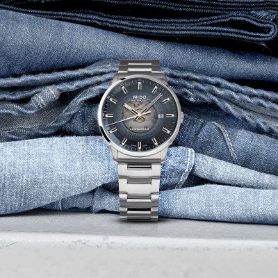 A série de relógios Mido Commander existe desde 1959. Ao longo dos anos, os relógios foram actualizados e, claro, equipados com as mais recentes inovações técnicas. O relógio Commander Gradient tem um mostrador especial, feito de acrílico transparente, que apresenta um gradiente de cor fumado, tornando-se cada vez mais opaco nas extremidades. Isto significa que o funcionamento interno do relógio é visível através do mostrador - embora envolto num efeito de cor misterioso, enquanto a data às 3 horas e os ponteiros em forma de bastão se destacam perfeitamente. O relógio é alimentado por um movimento automático calibre 80 com uma impressionante reserva de marcha de 80 horas! Este movimento, com um belo rotor "guilhochado", é visível não só na parte da frente, mas também na parte de trás do relógio.