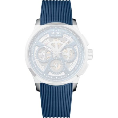 Esta bracelete de relógio MIDO é feita de borracha e está fixada ao relógio através de pinos carregados por mola de liberação rápida. A bracelete tem uma largura de 22 mm e fecha através de fivela borboleta. A bracelete tem uma montagem a direito, o que significa que esta bracelete é adequada para todos os relógios MIDO com montagem da bracelete a direito.