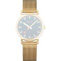 Esta bracelete de relógio Mondaine é feita de aço inoxidável e está fixada ao relógio através de pinos carregados por mola de liberação rápida. A bracelete tem uma largura de 18 mm e fecha através de fecho milanese. A bracelete tem uma montagem a direito, o que significa que esta bracelete é adequada para todos os relógios Mondaine com montagem da bracelete a direito.