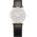 Esta bracelete de relógio Mondaine é feita de couro e está fixada ao relógio através de pinos carregados por mola de liberação rápida. A bracelete tem uma largura de 16 mm e fecha através de fecho. A bracelete tem uma montagem a direito, o que significa que esta bracelete é adequada para todos os relógios Mondaine com montagem da bracelete a direito.
