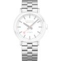 Esta bracelete de relógio Mondaine é feita de aço inoxidável e está fixada ao relógio através de pinos de pressão. A bracelete tem uma largura de 20 mm e fecha através de fivela dobrável com segurança. A bracelete não tem uma montagem a direito, o que significa que esta bracelete só é adequada para os relógios listados abaixo.
