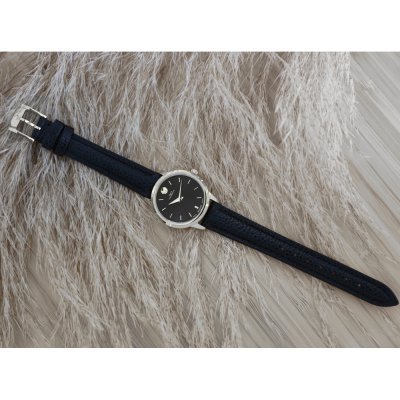 Este relógio Movado tem uma caixa de Inox com um diâmetro de 30 mm e está equipado com uma bracelete de couro. A caixa possui um movimento Sellita e o relógio tem um vidro Safira.