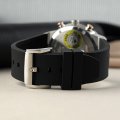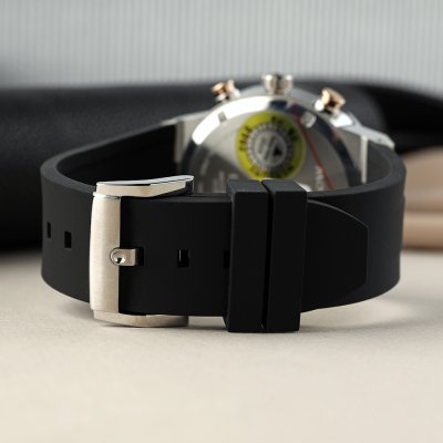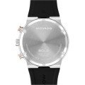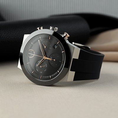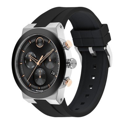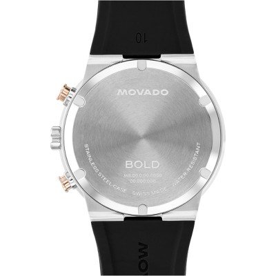 Este relógio Movado tem uma caixa de Inox com um diâmetro de 44 mm e está equipado com uma bracelete de borracha. A caixa possui um movimento Ronda e o relógio tem um vidro K1 Mineral.