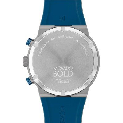 Este relógio Movado tem uma caixa de Inox com um diâmetro de 44 mm e está equipado com uma bracelete de borracha.