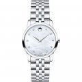 Este relógio Movado tem uma caixa de Inox com um diâmetro de 28 mm e está equipado com uma bracelete de Inox. A caixa possui um movimento ETA e o relógio tem um vidro Safira.