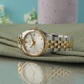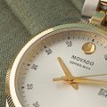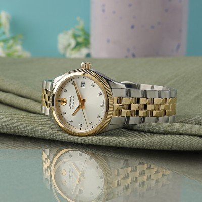 Este belo relógio clássico bicolor Movado para mulher apresenta 10 índices de diamantes genuínos e uma luneta canelada brilhante.