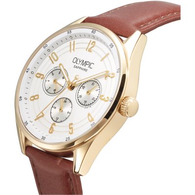 Este relógio Olympic tem uma caixa de Inox com um diâmetro de 40 mm e está equipado com uma bracelete de couro. A caixa possui um movimento Miyota e o relógio tem um vidro Safira.