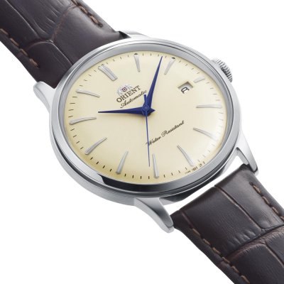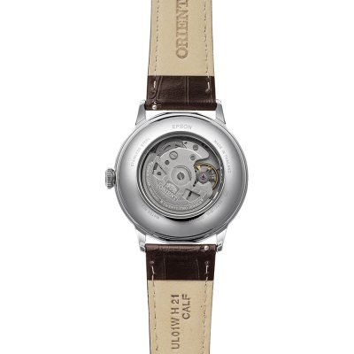 Este relógio Orient tem uma caixa de Inox com um diâmetro de 40 mm e está equipado com uma bracelete de couro. A caixa possui um movimento Orient e o relógio tem um vidro Mineral.