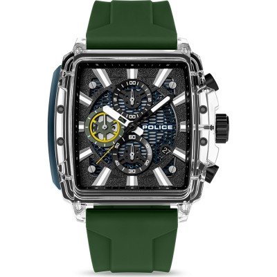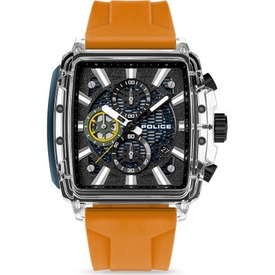Este relógio Police tem uma caixa de Resina com um diâmetro de 43 mm e está equipado com uma bracelete de borracha. A caixa possui um movimento Seiko Instruments Inc. e o relógio tem um vidro Acrílico.