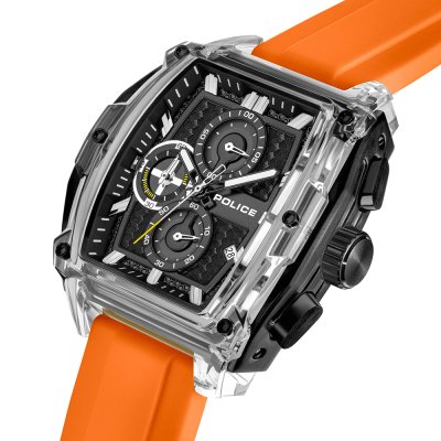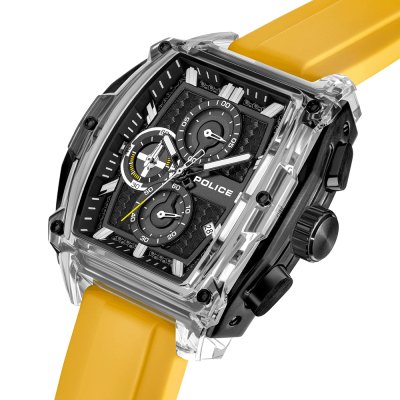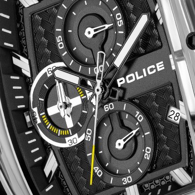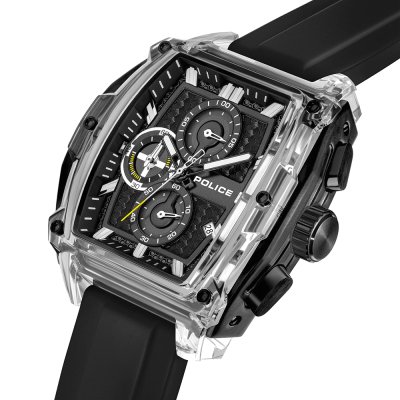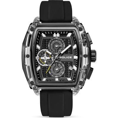 Este relógio Police tem uma caixa de Resina com um diâmetro de 46 mm e está equipado com uma bracelete de borracha. A caixa possui um movimento Seiko Instruments Inc. e o relógio tem um vidro Mineral.