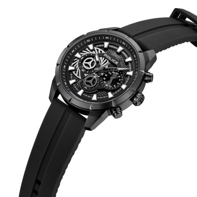 Este relógio Police tem uma caixa de Inox com um diâmetro de 45 mm e está equipado com uma bracelete de borracha. A caixa possui um movimento Seiko Instruments Inc. e o relógio tem um vidro Mineral.
