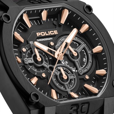 Este relógio Police tem uma caixa de Inox com um diâmetro de 45 mm e está equipado com uma bracelete de couro. A caixa possui um movimento Seiko Instruments Inc. e o relógio tem um vidro Mineral.