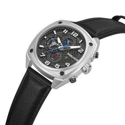 Este relógio Police tem uma caixa de Inox com um diâmetro de 45 mm e está equipado com uma bracelete de couro. A caixa possui um movimento Seiko Instruments Inc. e o relógio tem um vidro Mineral.