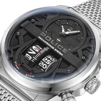 Este relógio Police tem uma caixa de Inox com um diâmetro de 44 mm e está equipado com uma bracelete de Inox. A caixa possui um movimento Bao Jie e o relógio tem um vidro Mineral.