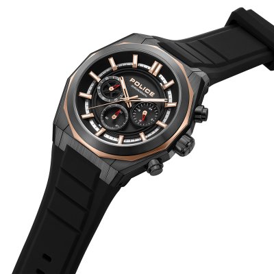 Este relógio Police tem uma caixa de Inox com um diâmetro de 46 mm e está equipado com uma bracelete de borracha. A caixa possui um movimento Seiko Instruments Inc. e o relógio tem um vidro Mineral.