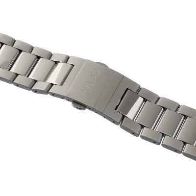 Esta bracelete de relógio Rado é feita de titânio e está fixada ao relógio através de pinos de pressão. A bracelete tem uma largura de 24 mm e fecha através de fivela dobrável com botões de pressão. A bracelete não tem uma montagem a direito, o que significa que esta bracelete só é adequada para os relógios listados abaixo.