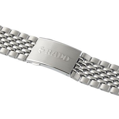 Esta bracelete de relógio Rado é feita de aço inoxidável e está fixada ao relógio através de pinos carregados por mola de liberação rápida. A bracelete tem uma largura de 21 mm e fecha através de fivela dobrável com botões de pressão. A bracelete não tem uma montagem a direito, o que significa que esta bracelete só é adequada para os relógios listados abaixo.