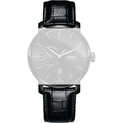 Esta bracelete de relógio Rado é feita de couro e está fixada ao relógio através de pinos de pressão. A bracelete tem uma largura de 21 mm. A bracelete tem uma montagem a direito, o que significa que esta bracelete é adequada para todos os relógios Rado com montagem da bracelete a direito.