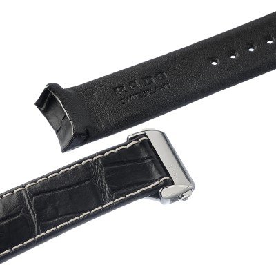 Esta bracelete de relógio Rado é feita de couro e está fixada ao relógio através de pinos de pressão. A bracelete tem uma largura de 22 mm e fecha através de fivela desdobrável. A bracelete não tem uma montagem a direito, o que significa que esta bracelete só é adequada para os relógios listados abaixo.