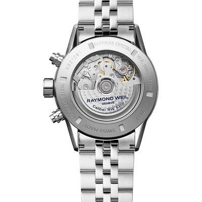 Este relógio Raymond Weil tem uma caixa de Inox com um diâmetro de 42 mm e está equipado com uma bracelete de Inox. A caixa possui um movimento Sellita e o relógio tem um vidro Safira.