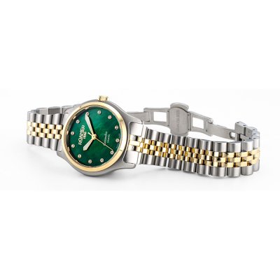 Este relógio Roamer tem uma caixa de Inox com um diâmetro de 31 mm e está equipado com uma bracelete de Inox. A caixa possui um movimento Ronda e o relógio tem um vidro Safira.