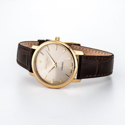 Este relógio Roamer tem uma caixa de Inox com um diâmetro de 30 mm e está equipado com uma bracelete de couro. A caixa possui um movimento Ronda e o relógio tem um vidro Safira.