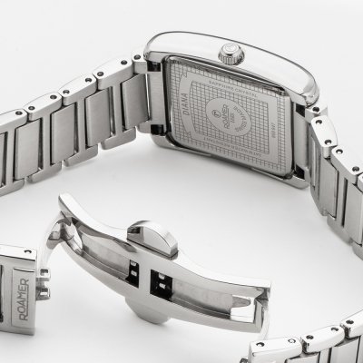 Este relógio Roamer tem uma caixa de Inox com um diâmetro de 22 mm e está equipado com uma bracelete de Inox. A caixa possui um movimento Ronda e o relógio tem um vidro Safira.
