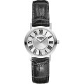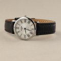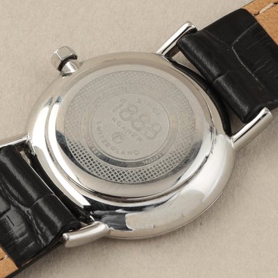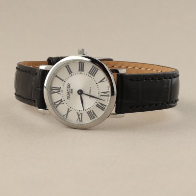 Este relógio Roamer tem uma caixa de Inox com um diâmetro de 28 mm e está equipado com uma bracelete de couro. A caixa possui um movimento Ronda e o relógio tem um vidro Safira.