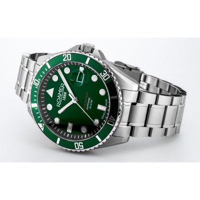 Este relógio Roamer tem uma caixa de Inox com um diâmetro de 43 mm e está equipado com uma bracelete de Inox. A caixa possui um movimento Ronda e o relógio tem um vidro Safira.