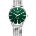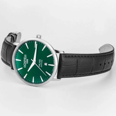Este relógio Roamer tem uma caixa de Inox com um diâmetro de 42 mm e está equipado com uma bracelete de couro. A caixa possui um movimento Ronda e o relógio tem um vidro Safira.