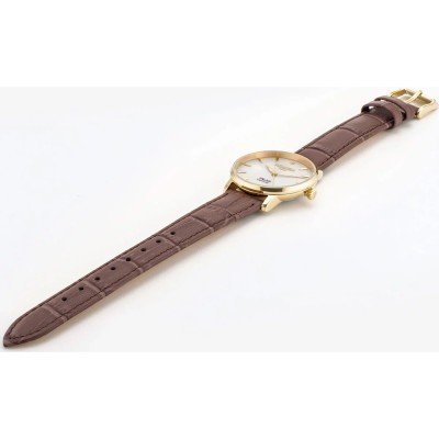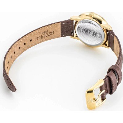 Este relógio Roamer tem uma caixa de Inox com um diâmetro de 32 mm e está equipado com uma bracelete de couro. A caixa possui um movimento Ronda e o relógio tem um vidro Safira.
