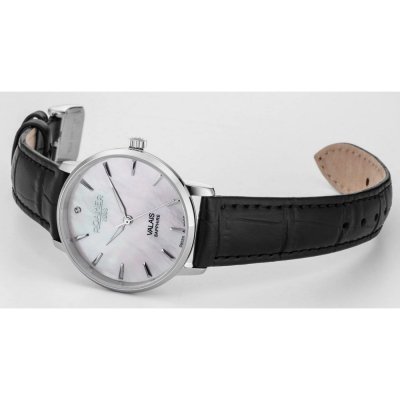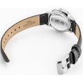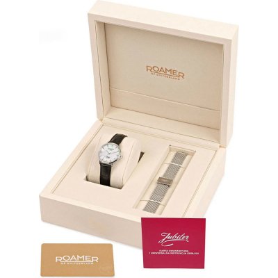 Este relógio Roamer tem uma caixa de Inox com um diâmetro de 32 mm e está equipado com uma bracelete de couro. A caixa possui um movimento Ronda e o relógio tem um vidro Safira.