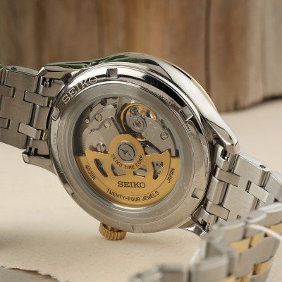 Este relógio Seiko tem uma caixa de Inox com um diâmetro de 41.8 mm e está equipado com uma bracelete de Inox. A caixa possui um movimento Seiko e o relógio tem um vidro Safira.