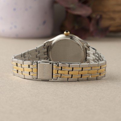 Este relógio Seiko tem uma caixa de Inox com um diâmetro de 29 mm e está equipado com uma bracelete de Inox. A caixa possui um movimento Seiko e o relógio tem um vidro Safira.